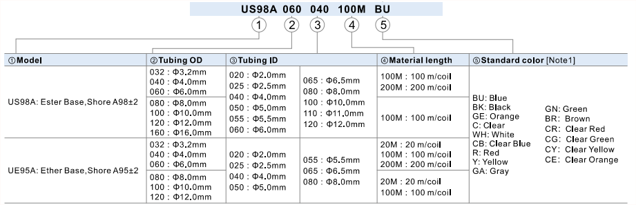 | Model | Tubing OD (Đường kính ngoài) | Tubing ID (Đường kính trong) | Material length (Chiều dài cuộn) | Standard color (Màu tiêu chuẩn) |
